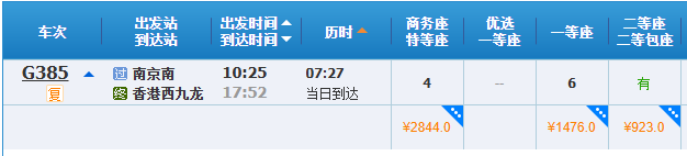 昨天凌晨,香港西九龙站到南京南高铁正式上线12306。今早,南京前往香港的去程高铁票也已上线。据了解,票价实施动态折扣。