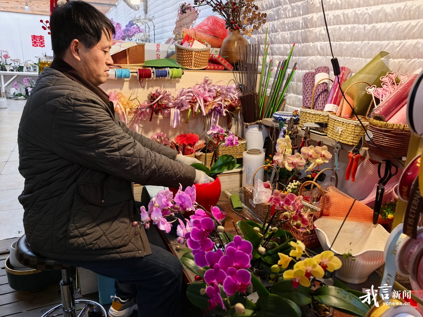 1月13日,盐都花卉批发市场内,暖流裹挟着花香扑面而来。市民袁女士正在精心搭配一盆混色蝴蝶兰,“过年了,给家里添点喜气和生机。”一旁,店主侯永平正根据订单,指挥工人打包送货。与此同时,盐都台创园共富兰园内,智能温室里恒温恒湿,村干部们指尖翻飞,正为一株株蝴蝶兰做最后的塑形。