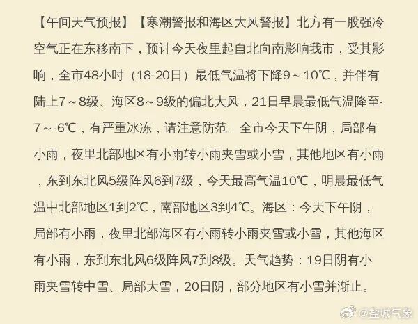 全市48小时(18-20日)最低气温下降8~10℃,20-23日气温持续偏低,最低气温维持在-8~-6℃,且20-21日最高气温在-1~0℃,有严重冰冻。
