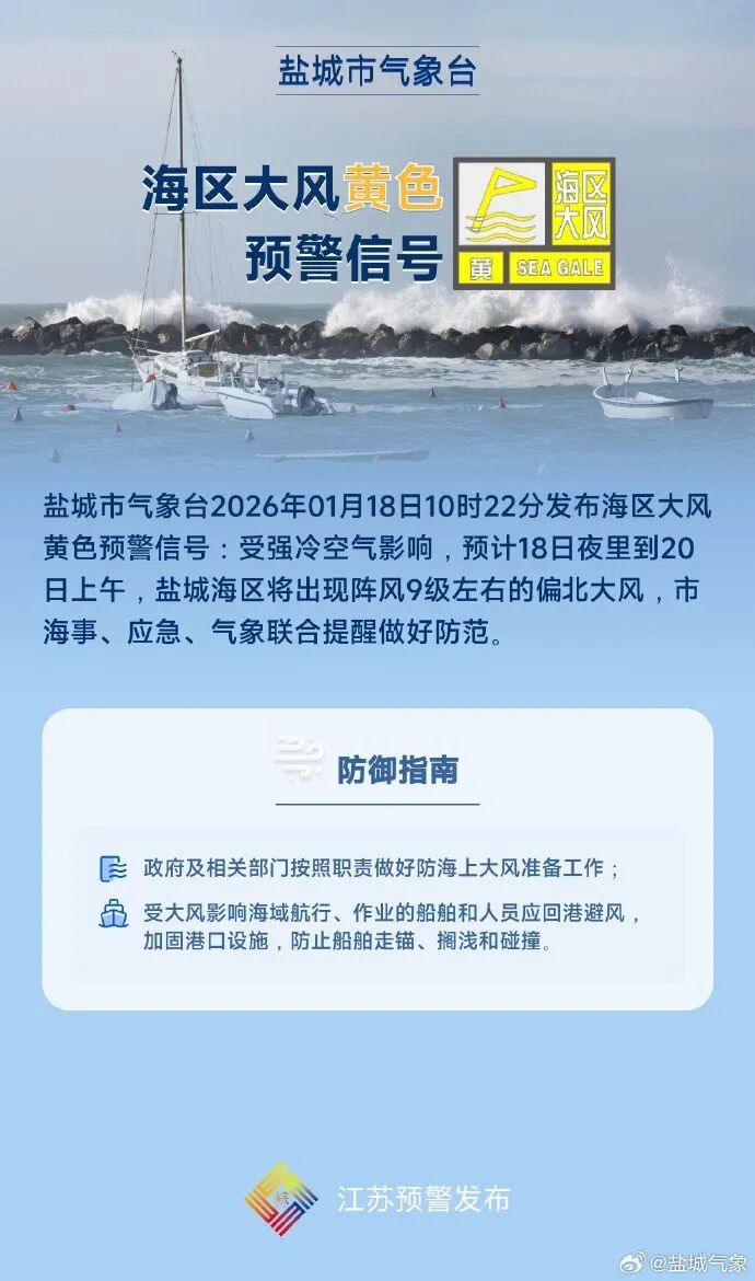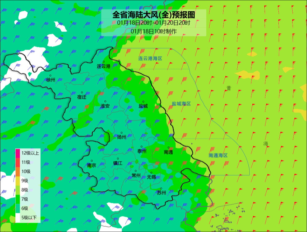 18日夜间至19日将出现陆上5~6级阵风7~8级、海区7级阵风8~9级的偏北大风,20日白天风力逐渐减弱,但海区仍有7~8级阵风。
