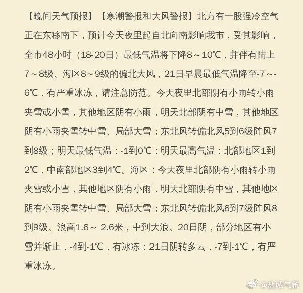 受其影响,18—20日全省自北向南有一次雨雪、明显降温和大风过程。全省48小时最低气温降幅8~11℃,局地12~13℃;21—23日全省持续低温,最低气温:淮北地区-9~-14℃,苏南地区-3~-6℃,其他地区-6~-9℃;淮北地区气温将达入冬以来最低,有严重冰冻。