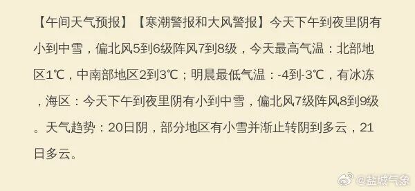 20日,阴,部分地区有小雪并渐止转阴到多云,偏北风4到5级阵风6级,气温-4℃到-1℃,有冰冻;