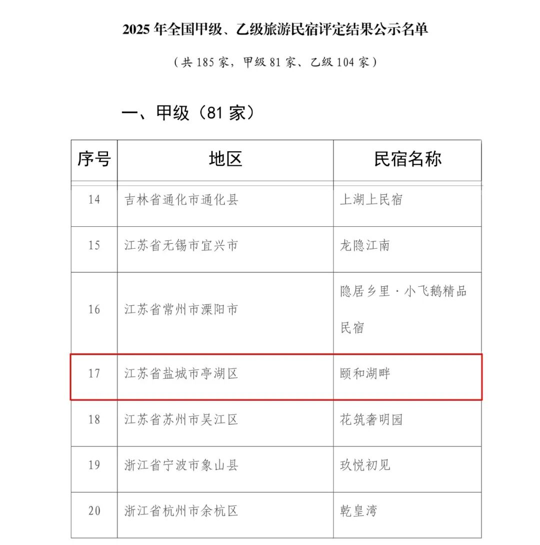 近日,文化和旅游部公示2025年全国甲级、乙级旅游民宿评定结果,认定185家旅游民宿基本达到甲级、乙级旅游民宿标准,其中甲级81家、乙级104家。盐城市亭湖区大洋湾颐和湖畔入选甲级旅游民宿,成为盐城唯一一家获此认证的民宿。