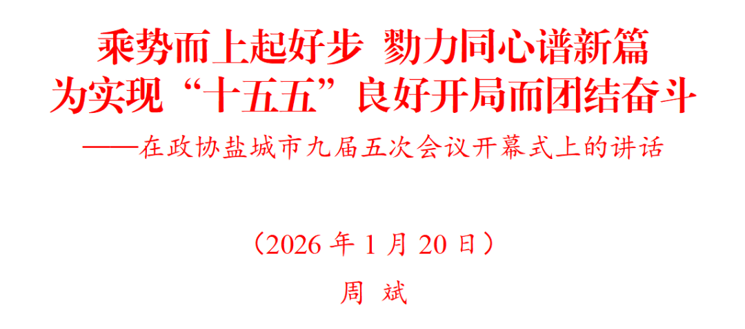 各位委员,同志们!山一程,水一程,逐梦向前行。今年是“十五五”开局之年。开局之年当有开局之势,起步之时当有关键之为。不久前召开的市委八届十一次全会和市委经济工作会议,发出了打造“国际湿地、沿海绿城、江淮门户”的动员令,擘画了未来五年盐城经济社会发展蓝图,部署了2026年经济工作目标任务。我们要锚定目标、鼓足干劲,守正创新、锐意进取,以坚如磐石的信念、只争朝夕的劲头、坚韧不拔的毅力,乘势而上起好步、勠力同心谱新篇,奋力把中国式现代化盐城新实践不断推向前进。