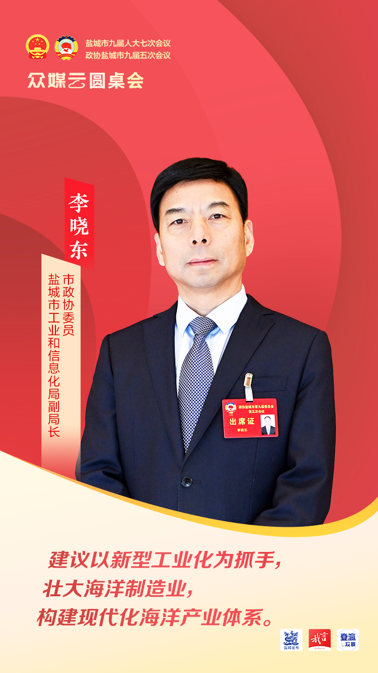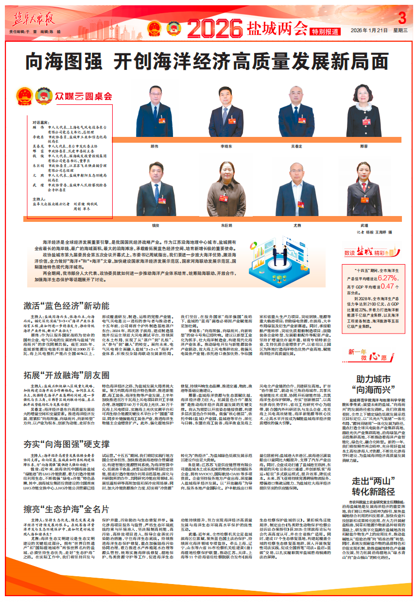 盐城师范学院海洋与地理科学学院院长李传武:展望未来的盐城,“向海而兴”的发展路径愈发清晰。我们欣喜地看到,全市上下锚定绿色低碳发展示范区目标定位,以“风光火气氢储”一体化布局、“源网荷储用”一体化发展为路径,重点打造全球风电装备产业集群高地、晶硅光伏产业集群高地、沿海绿氢产业示范集群高地,不断推动着海洋产业智能化、绿色化、融合化转型。新的一年,我们将按照市两会精神,充分用好盐城本土高校涉海人才资源,不断优化涉海学科建设,为盐城海洋经济高质量发展贡献力量。