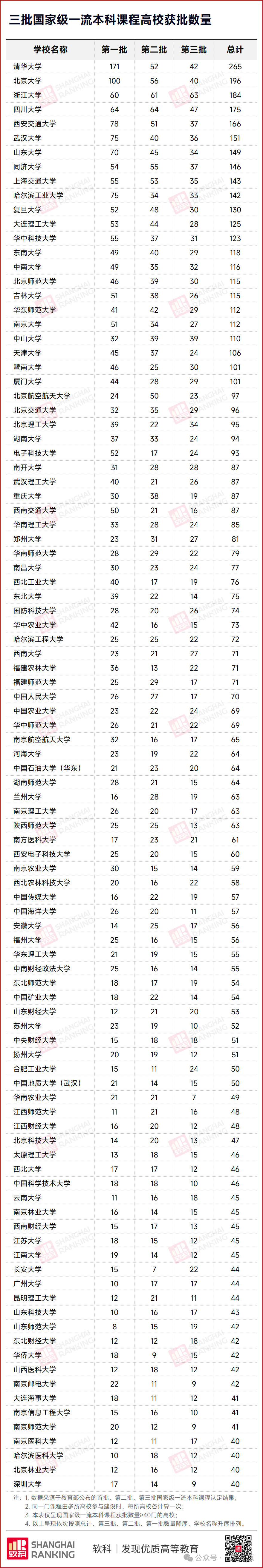 纵观三批国家级一流本科课程获批高校,东南大学共获批118门国家级一流本科课程,南京大学共获批112门国家级一流本科课程,南京航空航天大学共获批65门国家级一流本科课程。