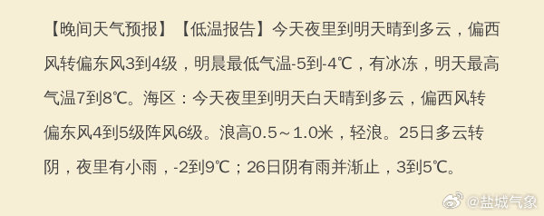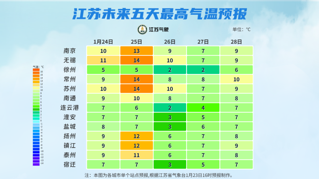 1月23日20时至1月24日20时,全省晴到多云。最高温度:本省西北部地区4℃左右,沿江和苏南地区9~10℃,其他地区7~8℃;最低温度:本省西北部地区-7~-8℃,沿江和苏南地区-2~-3℃,其他地区-4~-5℃,全省大部分地区有冰冻。