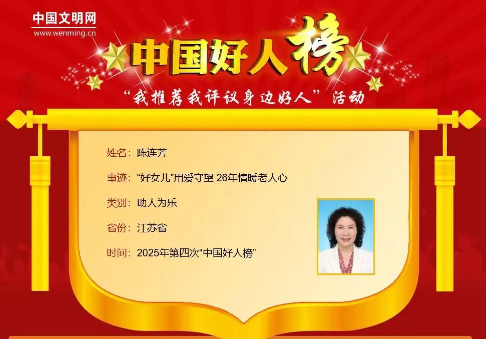 礼赞身边好人,汇聚奋进力量。1月23日,中央精神文明建设办公室在四川省宜宾市举办“中国好人榜”发布仪式,揭晓2025年第四批“中国好人榜”。经各地推荐、网友评议和专家评审等环节,全国共有139名助人为乐、见义勇为、诚实守信、敬业奉献、孝老爱亲身边好人入选。我市大丰区陈连芳光荣上榜