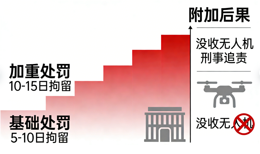 《条例》第五十一条第二款规定,违反本条例规定,未经批准操控微型、轻型、小型民用无人驾驶航空器在管制空域内飞行(常见为超过真高120米),或者操控模型航空器在空中交通管理机构划定的空域外飞行的,由公安机关责令停止飞行,可以处500元以下的罚款;情节严重的,没收实施违规飞行的无人驾驶航空器,并处1000元以上1万元以下的罚款。