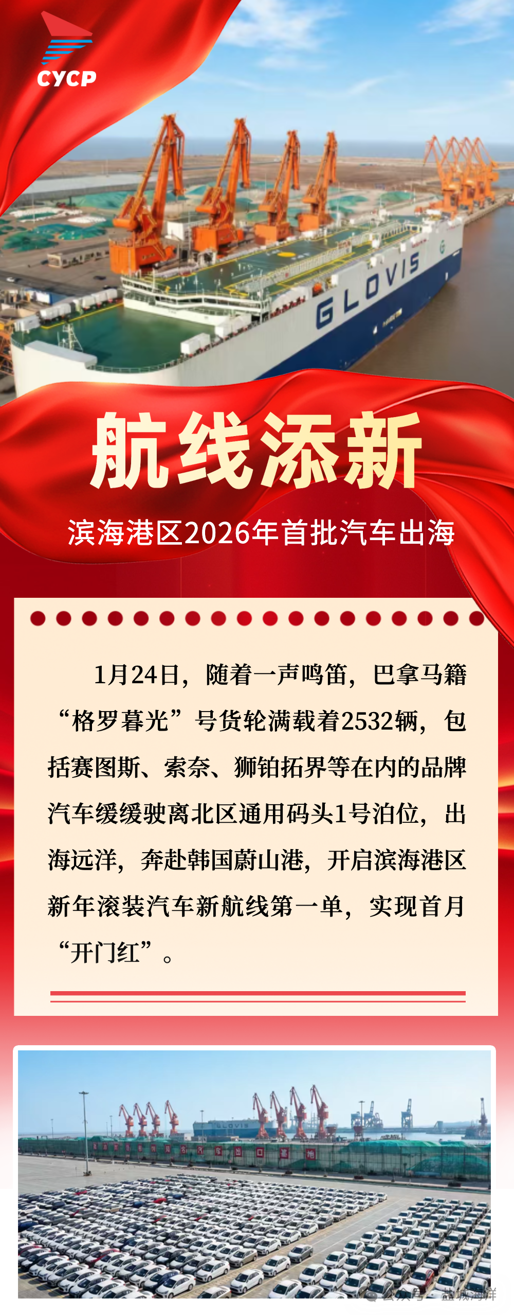 自2025年3月首单滚装汽车出口航线开通以来,滨海港已开辟至阿联酋迪拜、约旦,以及韩国釜山、木浦港的滚装航线4条,滨海港至韩国蔚山港航线是2026年首单开辟的第五条滚装外贸新航线。