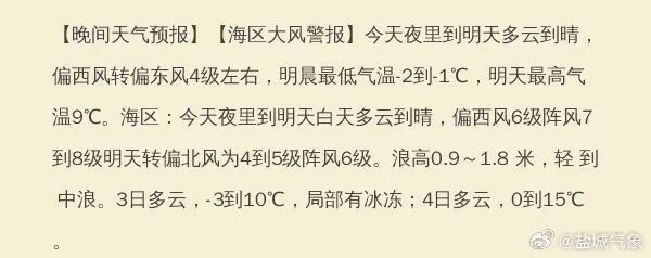 全省多云。最高温度:本省西南部地区12°C左右,其他地区10~11°C;最低温度:本省东北部地区-3~-4°C,其他地区-1°C左右。全省东南风4级左右。