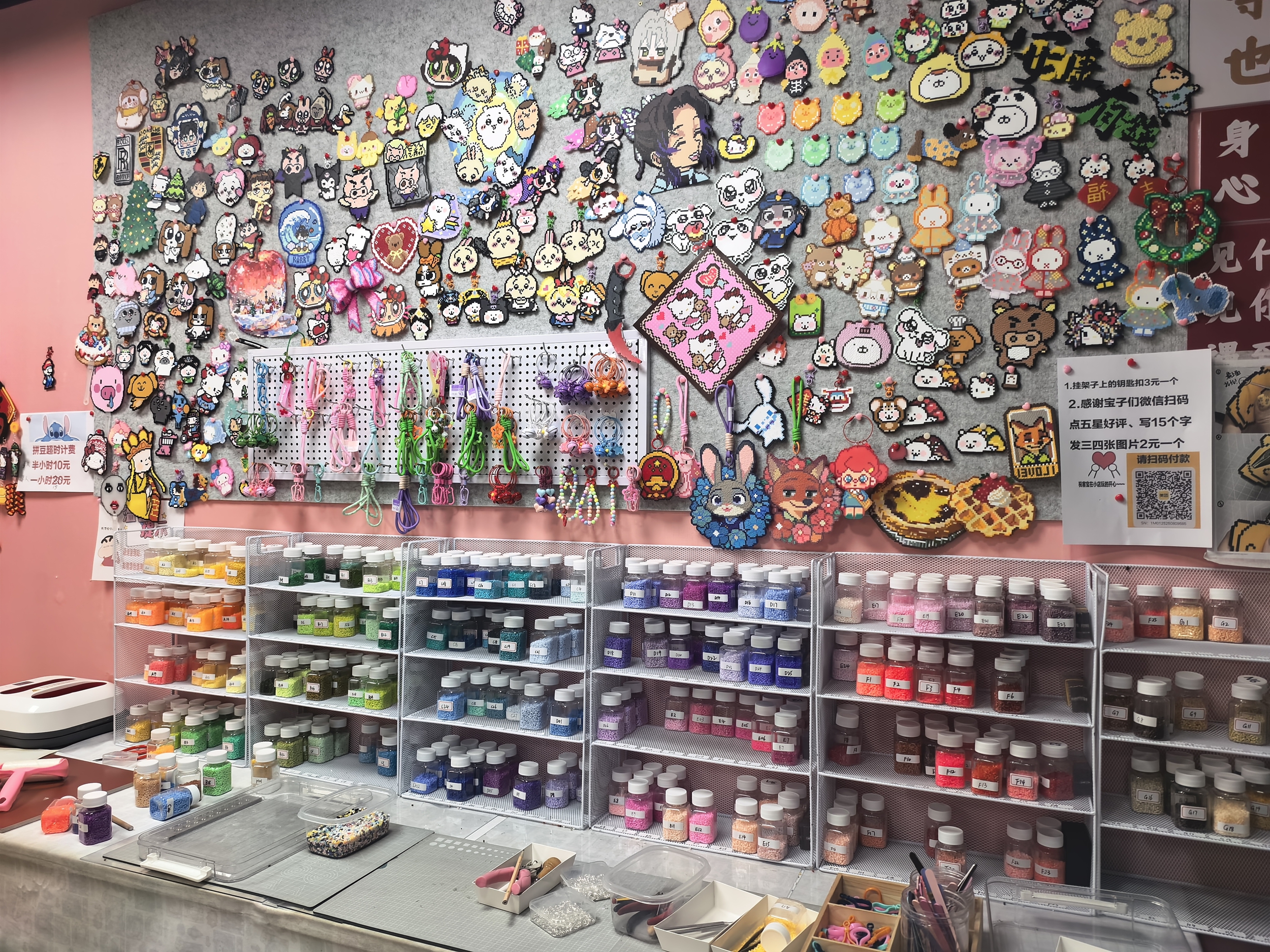 “来体验的以高中生、大学生和年轻上班族为主。”店长刘佳一边整理着按色号排列的豆子收纳盒,一边介绍,“很多客人是通过小红书、抖音被种草的,看到喜欢的图案就想自己动手做一个。”