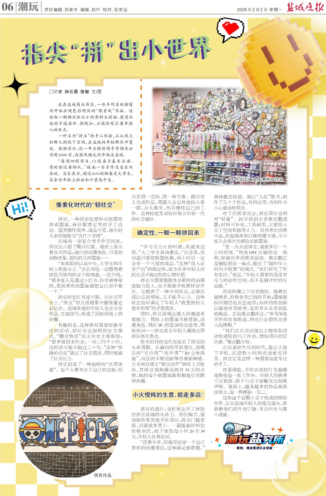 这些由千百颗小豆子组成的缤纷世界,正从盐城年轻人的指尖诞生,承载着他们的片刻宁静、专注时光与微小成就。