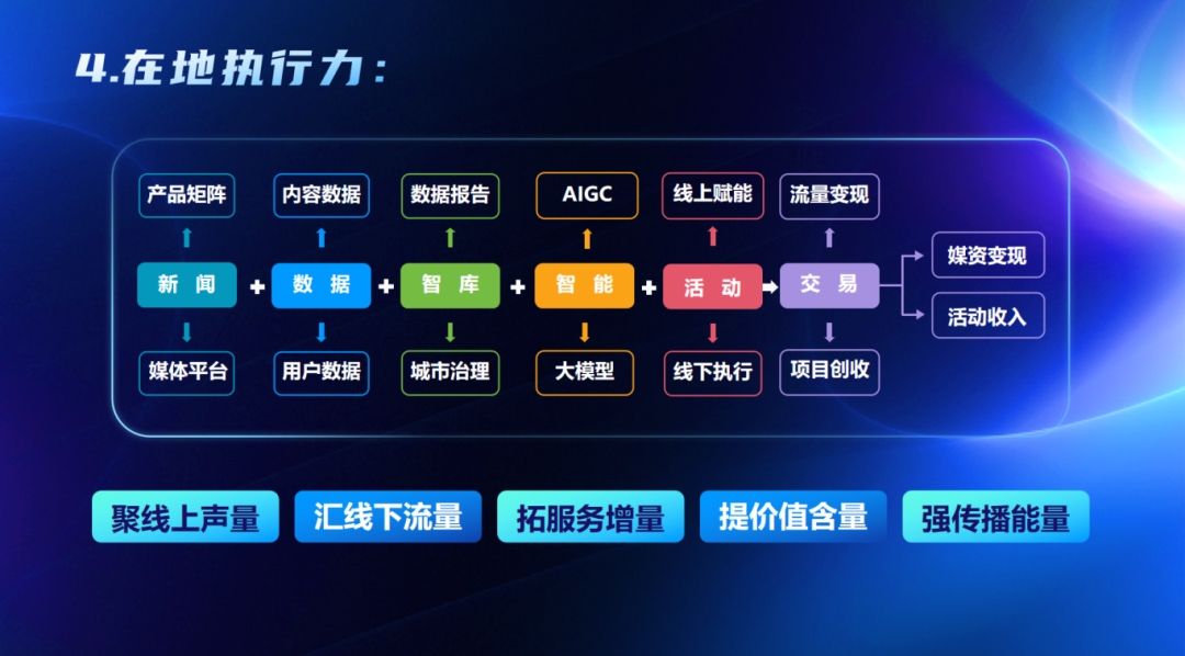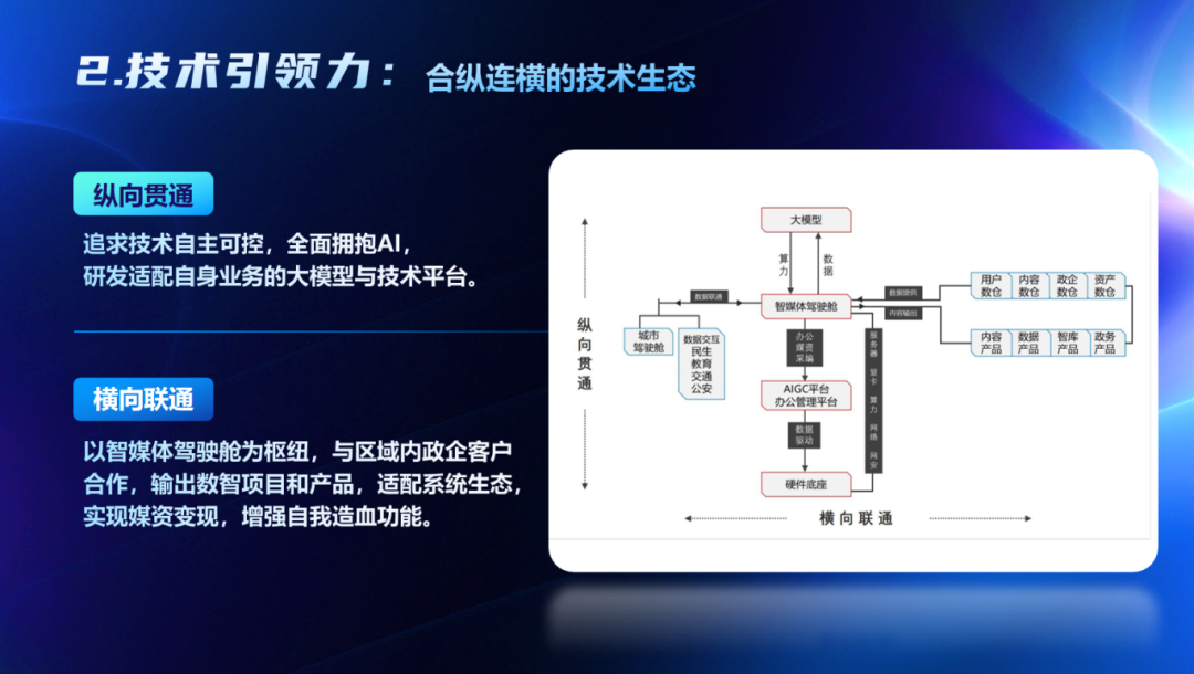 技术引领力,构建合纵连横的技术生态。纵向贯通,追求技术自主可控,全面拥抱AI,研发适配自身业务的大模型与技术平台。横向联通,以智媒体驾驶舱为枢纽,与区域内政企客户合作,输出数智项目和产品,适配系统生态,实现媒资变现,增强自我造血功能;