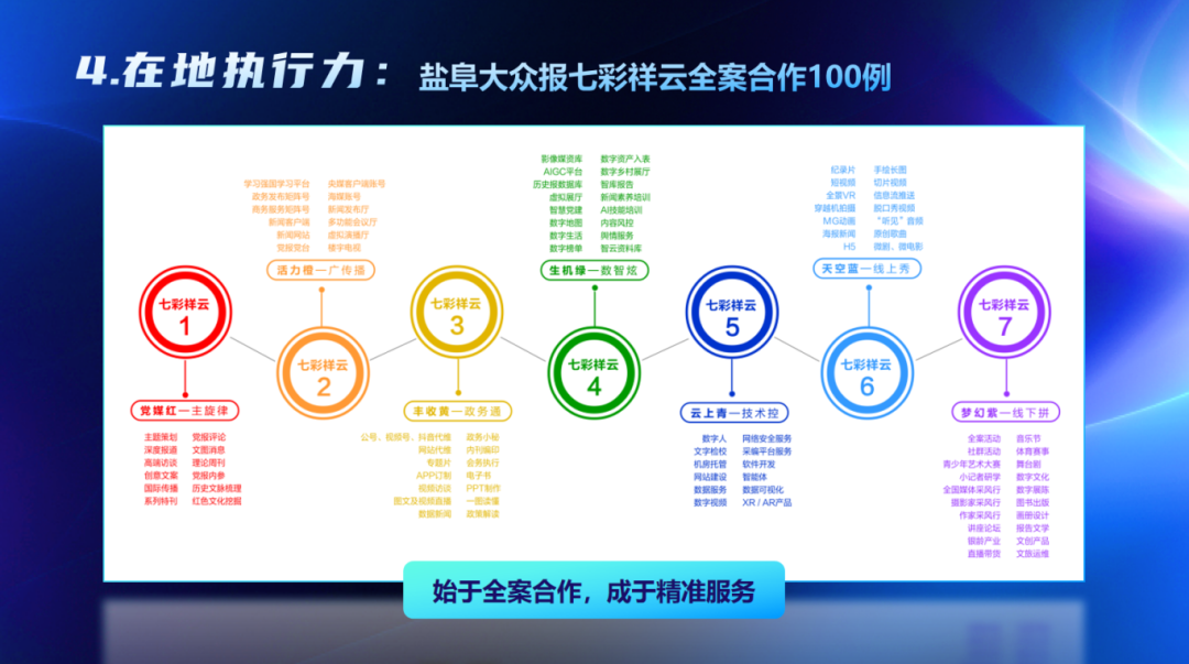 在地执行力,聚焦本地刚需,以“新闻+数据+智库+智能+活动→交易”的全链路模式,打造“七彩祥云”全案合作100例,聚线上声量、汇线下流量、拓服务增量、提价值含量、强传播能量;