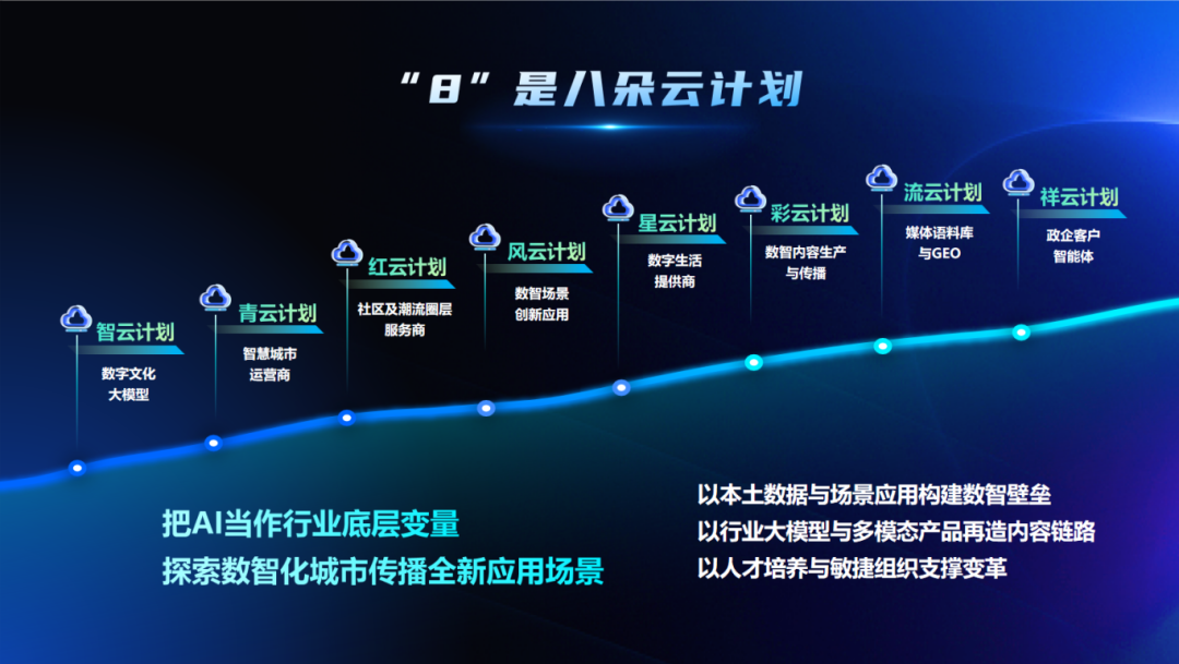 “8”,是引领数智化转型的八朵云计划,以本土数据与场景应用构建数智壁垒,以行业大模型与多模态产品再造内容链路,以人才培养与敏捷组织支撑变革,把AI当作行业底层变量,探索数智化城市传播的全新应用场景。该计划包含智云计划——数字文化大模型,青云计划——智慧城市运营商,红云计划——社区及潮流圈层服务商,风云计划——数智场景创新应用,星云计划——数字生活提供商,彩云计划——数智内容生产与传播,流云计划——媒体语料库与GEO,祥云计划——政企客户智能体。