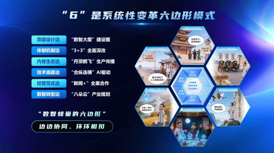 “6”,是系统性变革六边形模式,是该战略体系的核心支撑架构。集团从自然界高效稳定的蜂巢结构中汲取灵感,将顶层设计、体制机制、内容生态、技术底座、经营范式与数智转型六大要素有机整合、联动协同,构建起“边边呼应、环环相扣”的稳定变革生态。