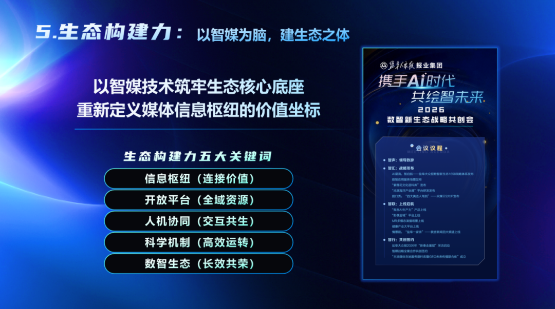 生态构建力,以智媒技术筑牢生态核心底座,重新定义媒体信息枢纽的价值坐标,通过开放平台、人机协同与科学机制,汇聚全域资源,构建长效共荣的数智生态。