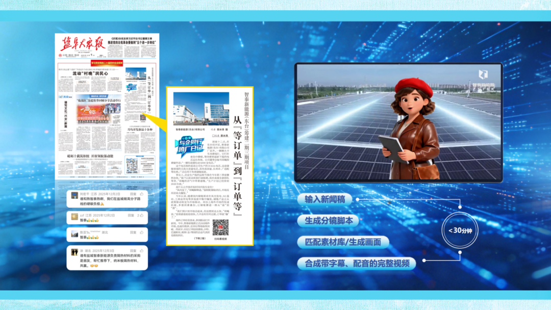 “我们的记者和编辑,不仅懂人、懂社会,还懂机器。”AI探索显著增强了集团深耕主业、服务客户的能力。以往以“天”为周期的视频内容生产,如今已缩短至以“小时”甚至“分钟”计算。报业集团能够以前所未有的速度与规模,响应热点,产出高品质、大流量的原创视觉内容,如《盐城储能电芯爆单》等视频产品,充分展示了AI赋能下的爆发式生产力。