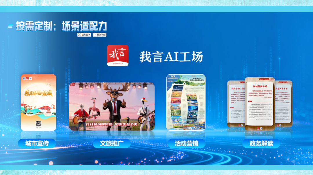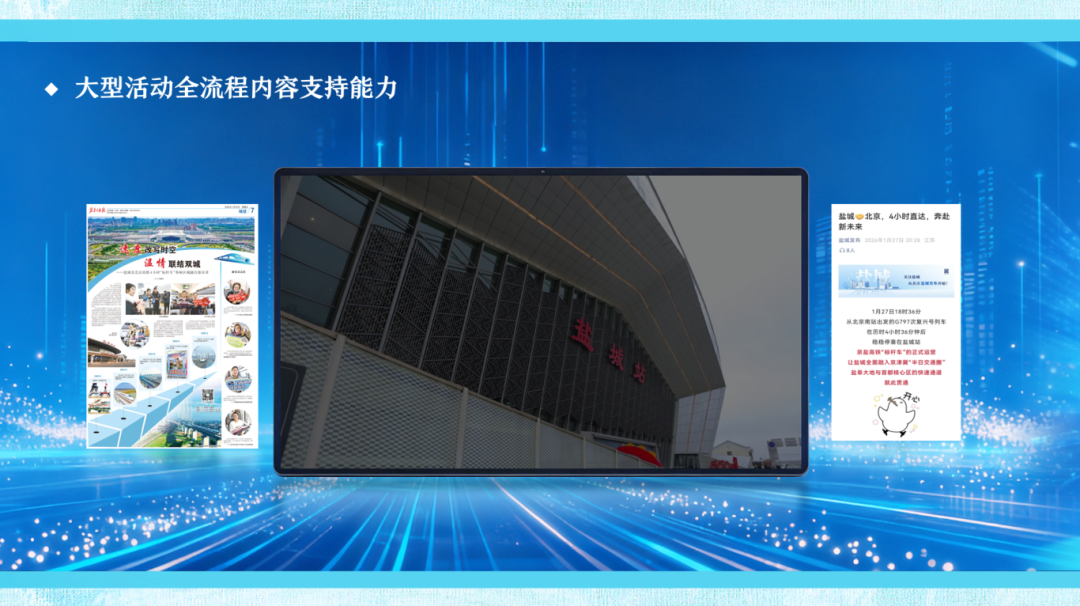 发布会现场快速轮播了多个落地案例:从打造城市数字名片的“飞阅盐城”VR项目,到服务全球滨海论坛的AI应用;从AI解读政府工作报告的政策智媒解读,到高效直达的融媒体新闻产品。这些案例证明了集团提供从策划到制作的全链条AI内容生产支持的实力。