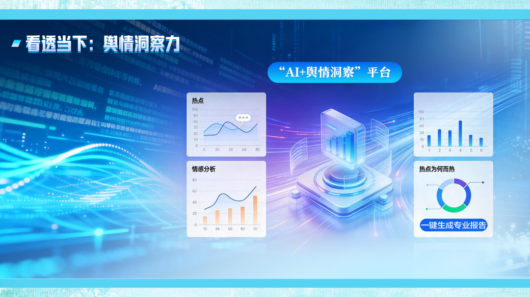 该平台能对全网舆情进行实时监测、智能研判与趋势预测,并借助自主知识产权的AI大模型,一键生成结构化的行业或地区分析报告,甚至快速转化为直观的视频解说。