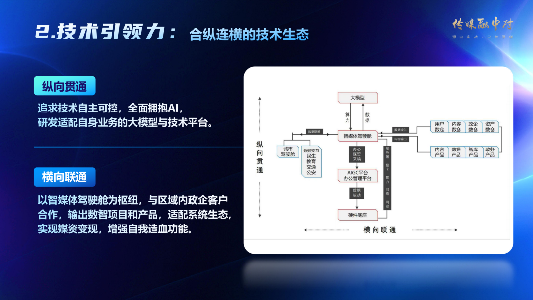技术引领力,构建合纵连横的技术生态。纵向贯通,追求技术自主可控,全面拥抱AI,研发适配自身业务的大模型与技术平台。横向联通,以智媒体驾驶舱为枢纽,与区域内政企客户合作,输出数智项目和产品,适配系统生态,实现媒资变现,增强自我造血功能;