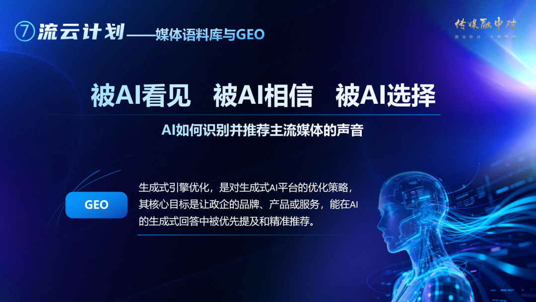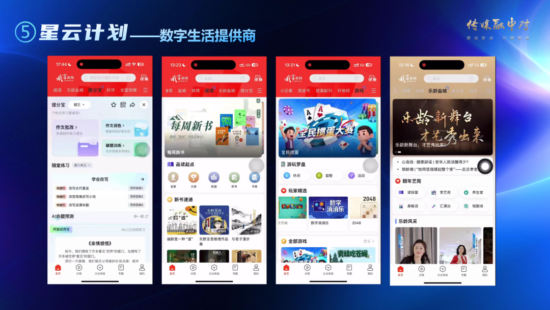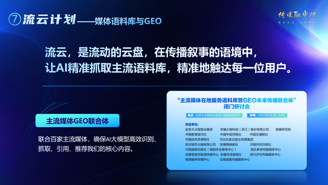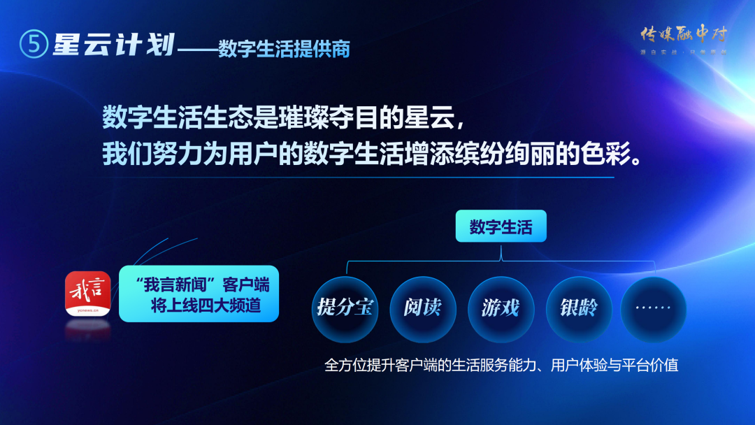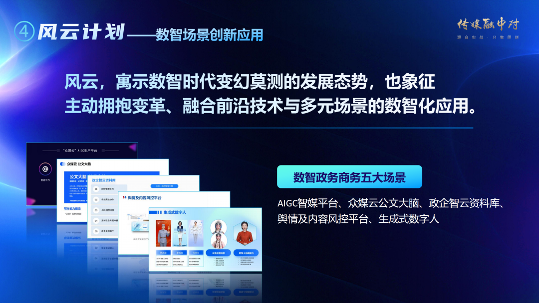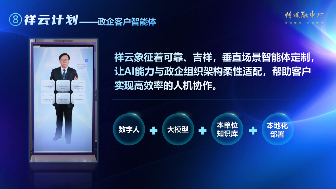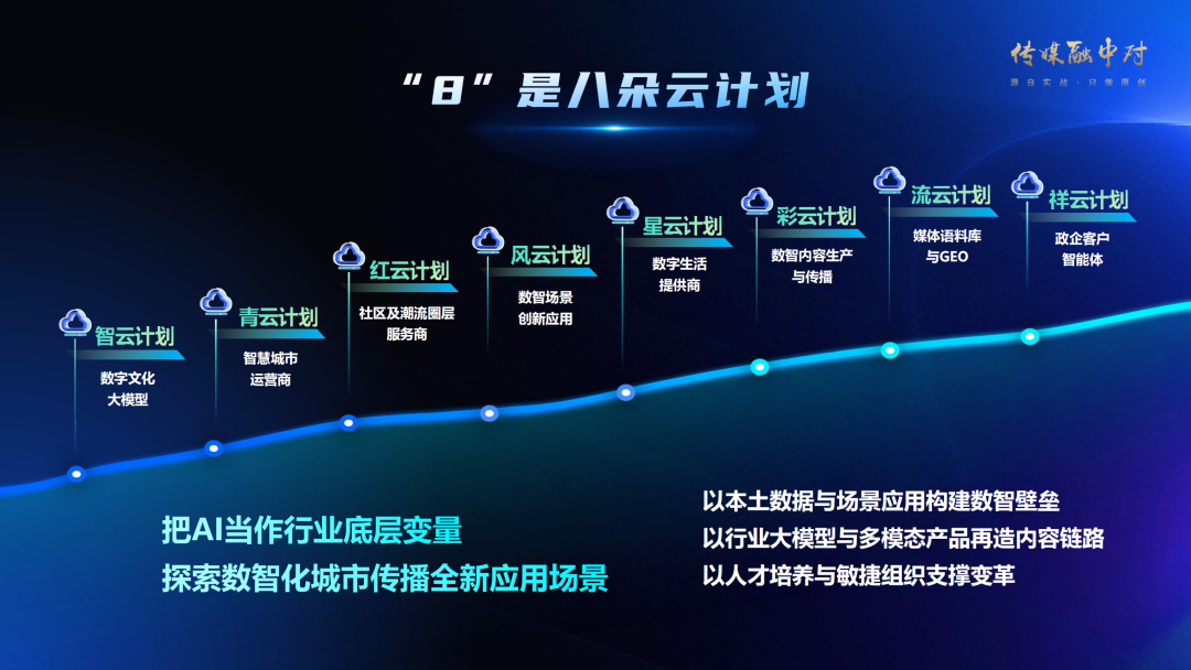 “8”,是引领数智化转型的八朵云计划,以本土数据与场景应用构建数智壁垒,以行业大模型与多模态产品再造内容链路,以人才培养与敏捷组织支撑变革,把AI当作行业底层变量,探索数智化城市传播的全新应用场景。该计划包含智云计划——数字文化大模型,青云计划——智慧城市运营商,红云计划——社区及潮流圈层服务商,风云计划——数智场景创新应用,星云计划——数字生活提供商,彩云计划——数智内容生产与传播,流云计划——媒体语料库与GEO,祥云计划——政企客户智能体。