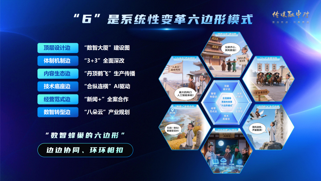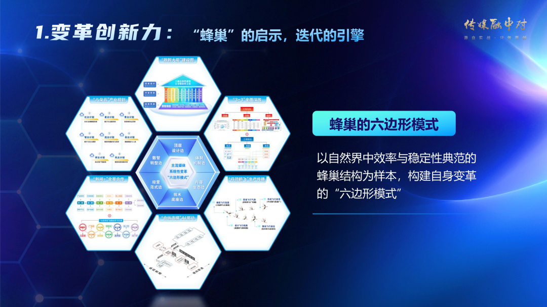 “6”,是系统性变革六边形模式,是该战略体系的核心支撑架构。集团从自然界高效稳定的蜂巢结构中汲取灵感,将顶层设计、体制机制、内容生态、技术底座、经营范式与数智转型六大要素有机整合、联动协同,构建起“边边呼应、环环相扣”的稳定变革生态。