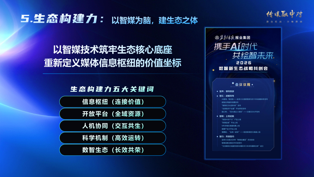 生态构建力,以智媒技术筑牢生态核心底座,重新定义媒体信息枢纽的价值坐标,通过开放平台、人机协同与科学机制,汇聚全域资源,构建长效共荣的数智生态。