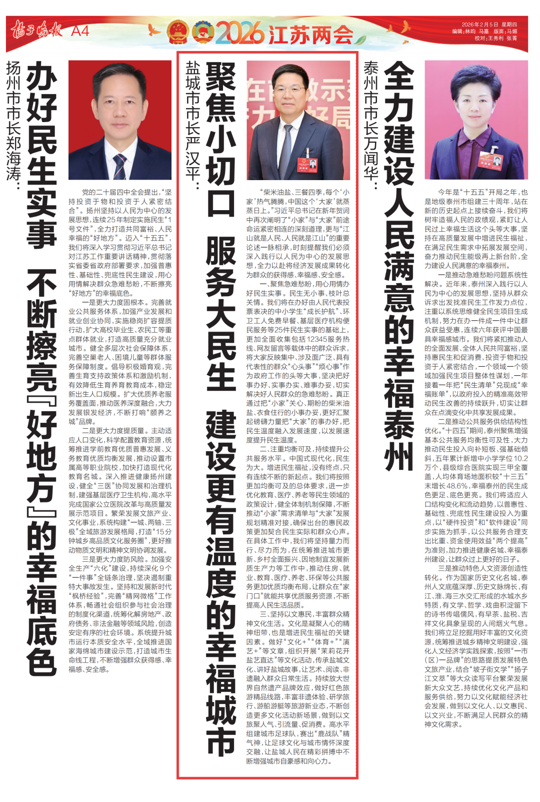今年是“十五五”开局之年,开局关乎全局,起步决定走势。严汉平表示,盐城将坚持以习近平新时代中国特色社会主义思想为指导,按照省委、省政府部署要求,始终牢记“走在前、挑大梁、多作贡献”使命担当,持续彰显“国际湿地、沿海绿城、江淮门户”城市定位,紧紧围绕“十五五”全市地区生产总值力争过万亿目标,坚定不移向海图强、向绿而兴、向新转型,2026年地区生产总值增长5.5%左右、社会消费品零售总额增长5.5%以上,不断巩固拓展经济稳中向好势头,为全省发展大局作出更加积极贡献。