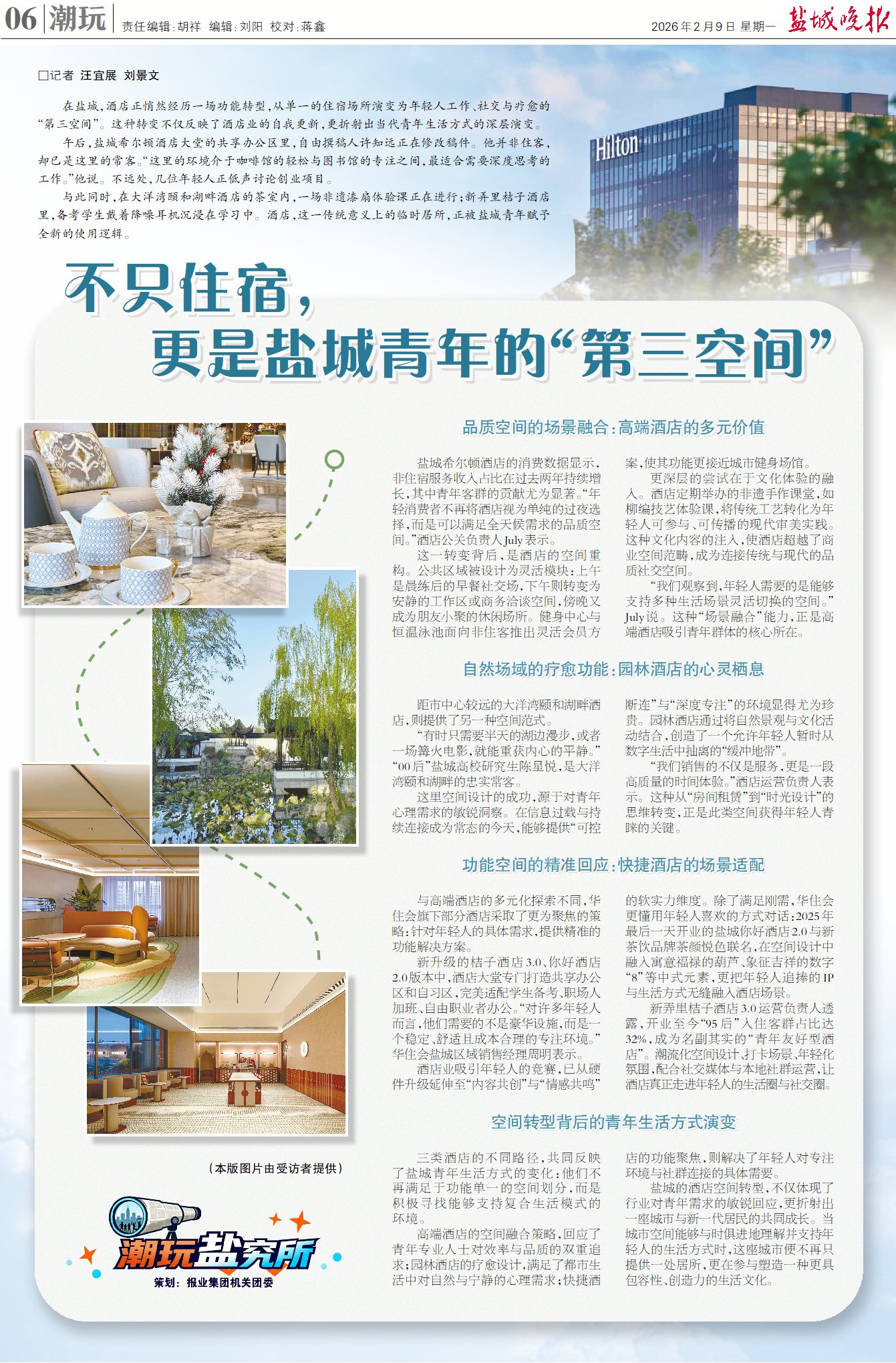 在盐城,酒店正悄然经历一场功能转型,从单一的住宿场所演变为年轻人工作、社交与疗愈的“第三空间”。这种转变不仅反映了酒店业的自我更新,更折射出当代青年生活方式的深层演变。