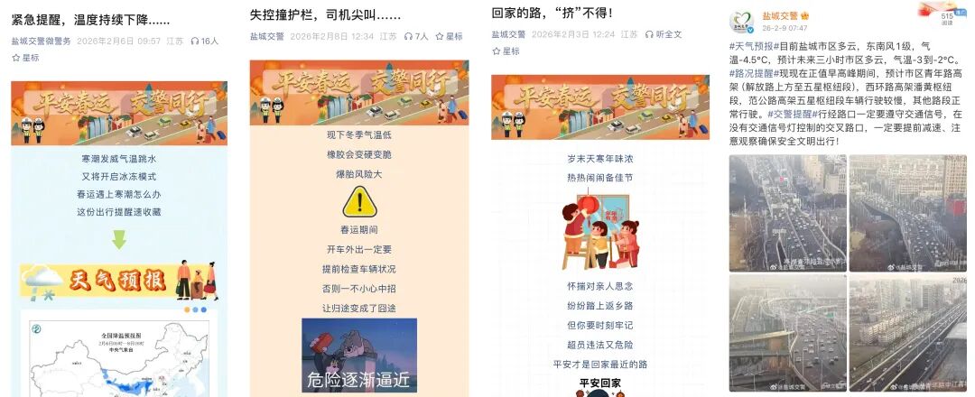 通过“盐城交警”新媒体矩阵联盟,提前发布“两公布一提示”,提醒广大群众及时了解路况及天气变化情况,合理安排出行时间、路线,引导错峰出行。