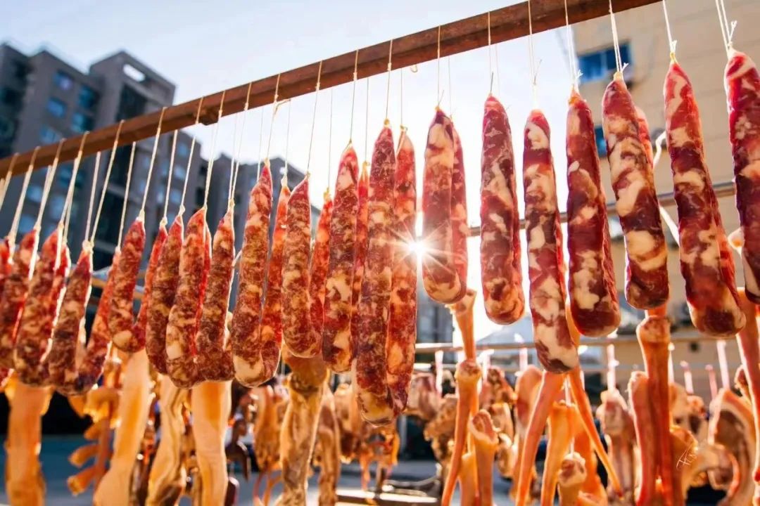 一根根饱满油亮的香肠挂满屋檐