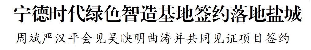 2月13日,宁德时代盐城新型电力系统锂电池绿色智造基地签约活动在盐举行。市委书记周斌、市长严汉平会见宁德时代新能源科技股份有限公司董事、区域管理总裁吴映明和董事长助理、企业策划部部长曲涛一行,并共同见证项目签约。