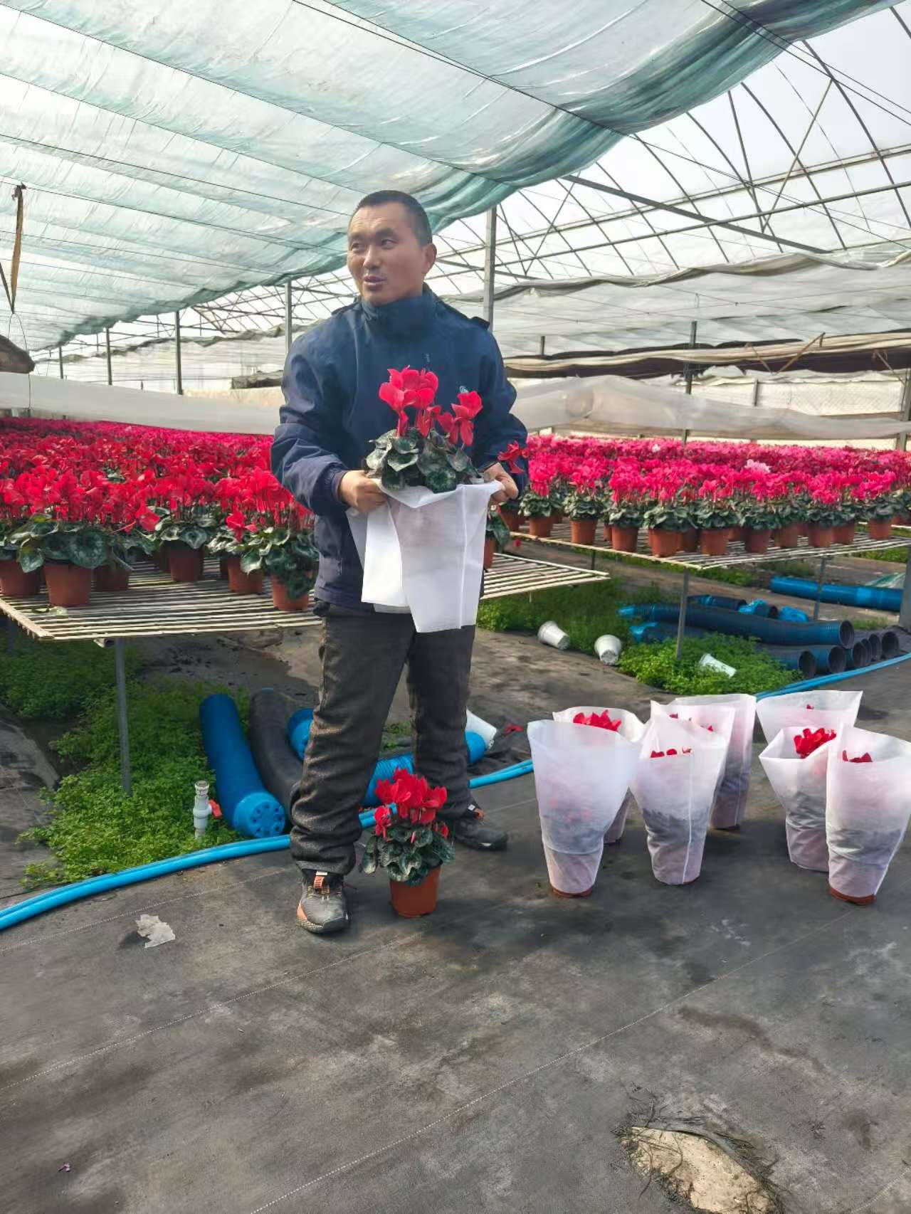 前来挑花的人络绎不绝,有批发商推着小推车一趟趟往外运,也有散客蹲在花床边细细比较花苞的大小,还有人举着手机视频连线,那头传来孩子的欢呼:“我就要那盆橘红色的!”