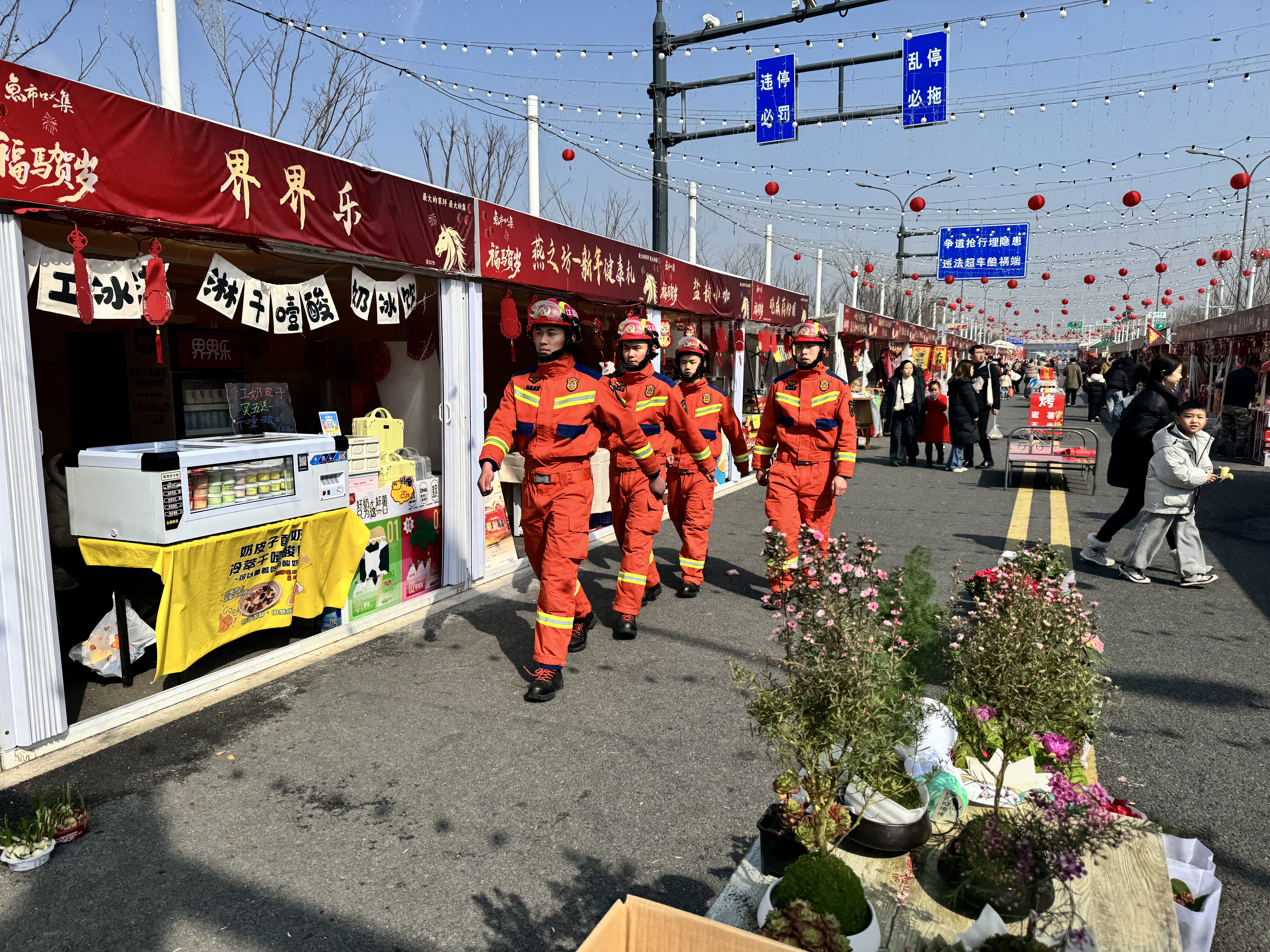 年货大集里,年味最浓处亦是守护最密处。鱼市口人流如织,腊味、春联、福字堆满摊位。刘浩楠和队友们身着醒目的橙色消防服,穿行于熙攘人群中,查灭火器、看疏散通道、叮嘱用电安全。大集属地实行全天候巡查,他们便是流动的“安全哨”。一位买年货的市民笑着说:“看到穿这身制服的在这转,心里踏实。”