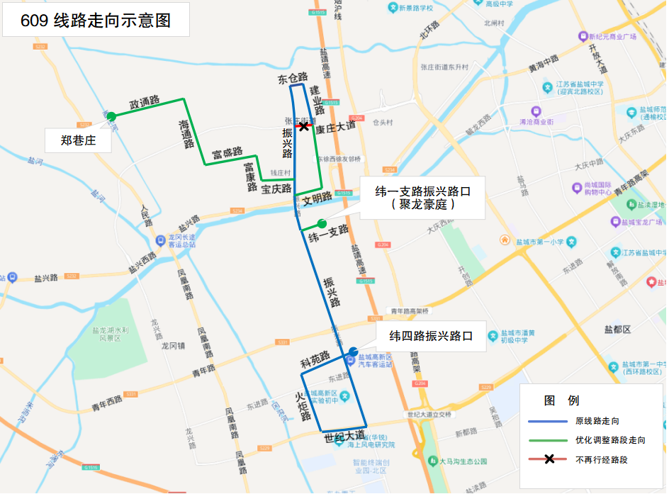 为进一步优化镇村公交线网布局,更好满足市民出行需求,盐城公交即日起优化公交609路,具体如下: