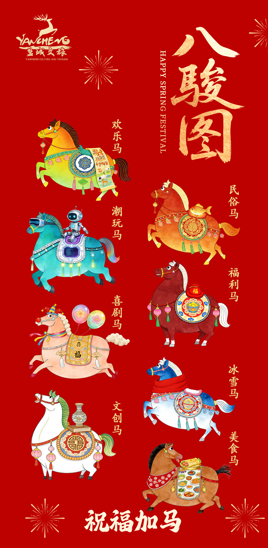 今年春节,盐城文旅以“滋味盐城过大年”为主题,精心烹制了一席可游、可赏、可品、可醉的文旅盛宴。更将这满城春色、遍地欢歌,绘成一幅“八骏图”——欢乐马、福利马、民俗马、潮玩马、文创马、喜剧马、冰雪马、美食马——八骏奋蹄,踏雪送福。我们在盐城,等您来过个有滋有味的中国年。