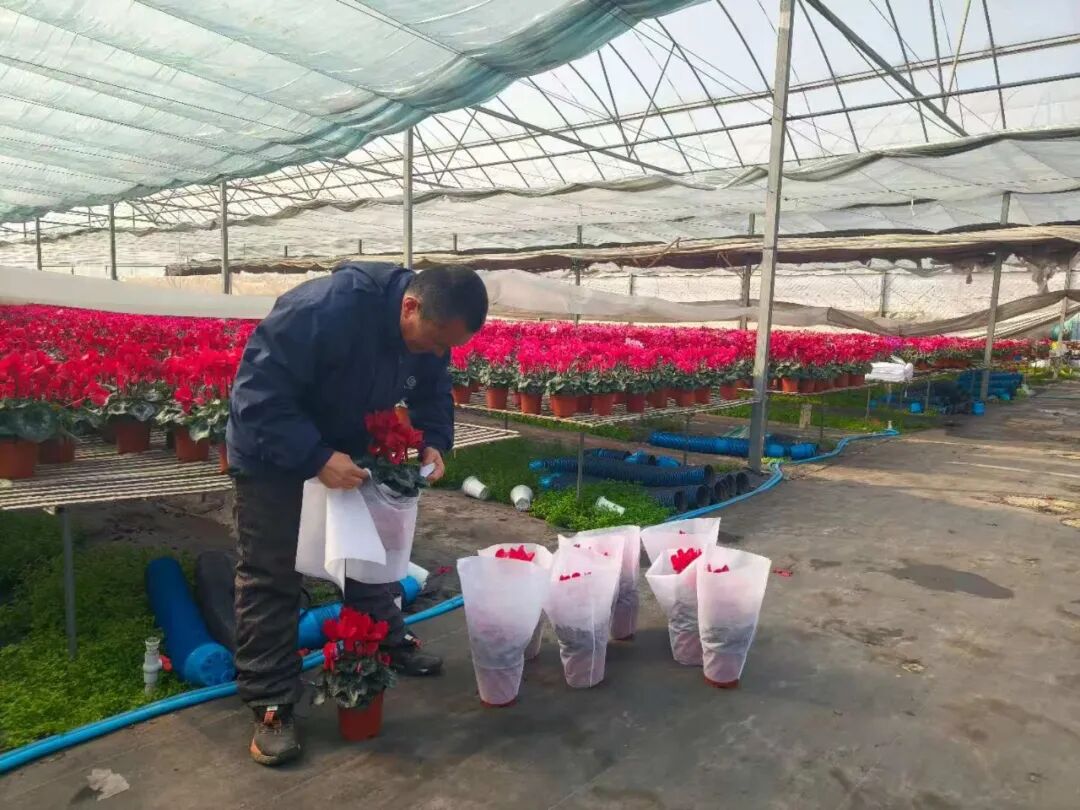近日,在东台市梁垛镇红芳花卉种植家庭农场里,8个大棚连成一片,掀开厚实的门帘,暖湿的空气裹挟着花香扑面而来,眼前是一片烂漫花海,前来挑花的人络绎不绝。