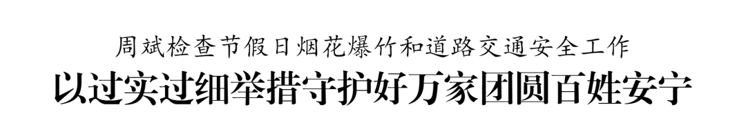 丙午马年春节将至,年味浓郁、万家团圆。2月16日除夕上午,市委书记周斌检查烟花爆竹和道路交通安全工作,强调要深入贯彻习近平总书记关于安全生产重要论述,认真落实中央和省委部署要求,深入践行以人民为中心的发展思想,以“时时放心不下”的责任感,抓实抓细安全生产各项工作,全力保障节日期间社会大局和谐稳定,确保人民群众度过一个平安欢乐祥和的新春佳节。