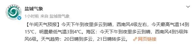 来源:中国天气、江苏气象、盐城气象、盐城发布综合