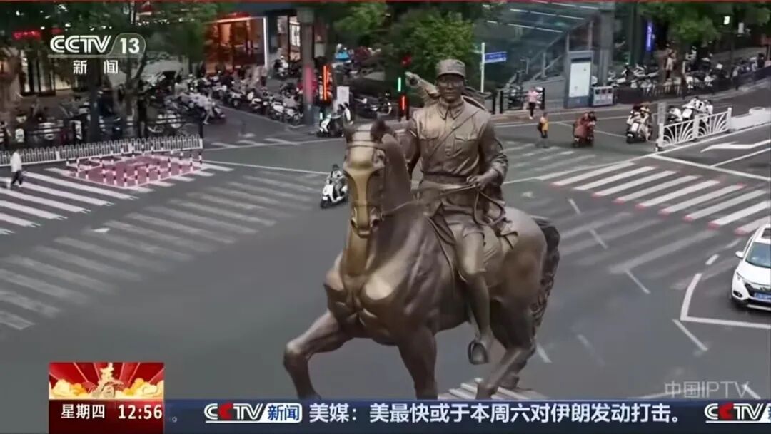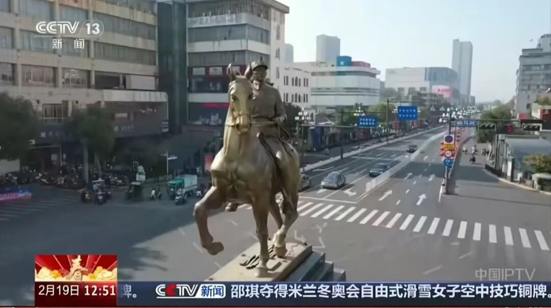 新四军纪念馆副研究员 陈宗彪:当时建起来以后,它的高度是4米,它的重量是3250多公斤。所以老百姓看了以后,在安装完成后,这匹马(雕塑)雄姿,前蹄扬起,一个新四军战士身背大刀,骑坐在马背上,面向东方,象征新四军东进(进取精神)。所以红色历史的传承在老百姓当中口口相传,“大铜马”就这么叫起来了。