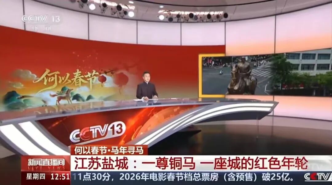2026年春节前夕,盐城建军路与解放路交汇处,车水马龙。95后青年成天扬站在“大铜马”前,手中攥着一张泛黄的老照片。照片里母亲抱着尚在襁褓中的他,照片外,他已长成宣传家乡风情的文旅博主,而身后的战马依然是记忆中那副坚毅的模样。对于盐城人来说,“大铜马”不仅是合影里的背景,更是生活里的坐标、心灵的归宿。在这座城,地名里藏着历史,街道里长着忠诚。翻开历史的褶皱,1941年1月,新四军在盐城浴火重生。这尊雕塑定格的正是一位身背大刀、面向东方的新四军战士,那是向着黎明冲锋的姿态。