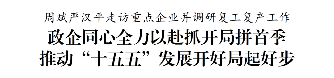 人勤春来早,奋进正当时。春节刚过,全市重点企业迅速从“假期模式”切换至“生产模式”,开足马力赶订单、拓市场。近日,市委书记周斌、市长严汉平分别开展“企业大走访”活动,围绕“六问”上门对接需求,调研复工复产工作,勉励广大企业坚定信心、乘势而上,政企同心奋力冲刺一季度目标任务,为全年经济社会高质量发展蓄势赋能,推动“十五五”开好局、起好步。