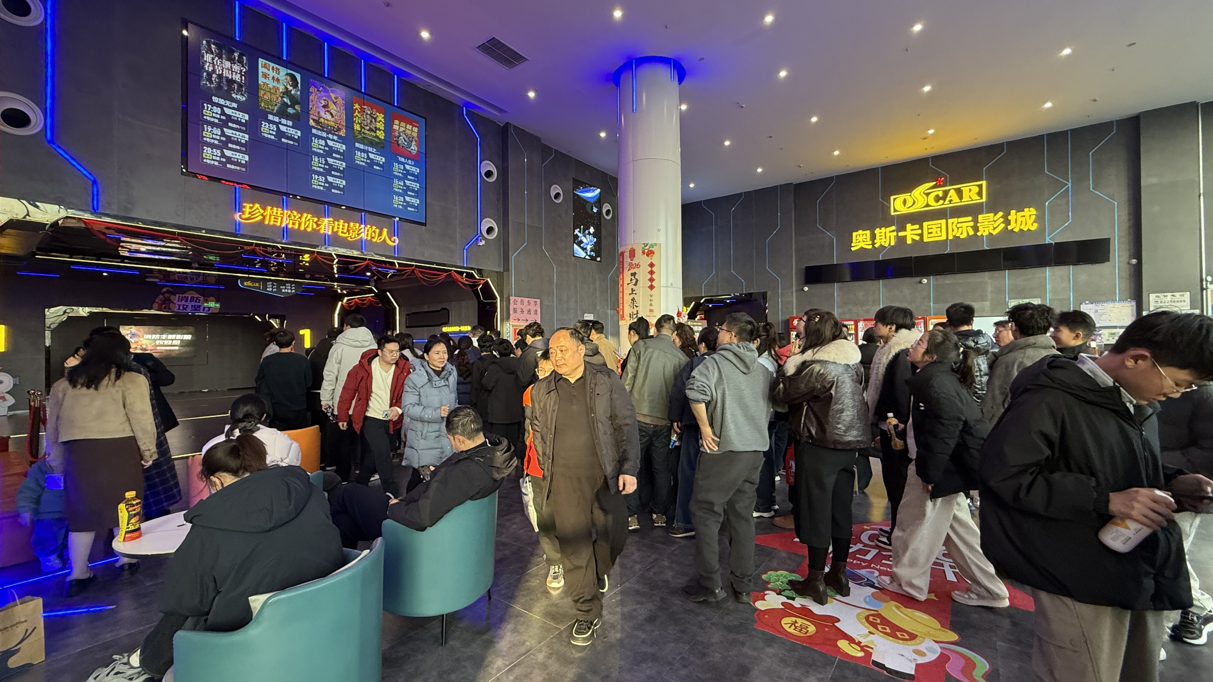 亭湖奥斯卡影城以“2026马力全开 马年行大运”为主题,设置了吉祥铜锣抽奖区。观众凭票根扫码进群敲锣即可参与“跃马抽奖”,赢取免费观影券、电影周边等福利。同时推出“福马贺岁”打卡活动,观众在主题背景墙拍照分享至社交平台,可领取马年钥匙扣。活动上线首日便吸引超500人次参与,现场热闹非凡。影城负责人韩园园说:“我们希望通过这些充满年味的活动,让观众在观影之余,感受到浓浓的节日氛围,也为大家提供一个互动交流的平台,让看电影成为一种更具仪式感的春节活动。”