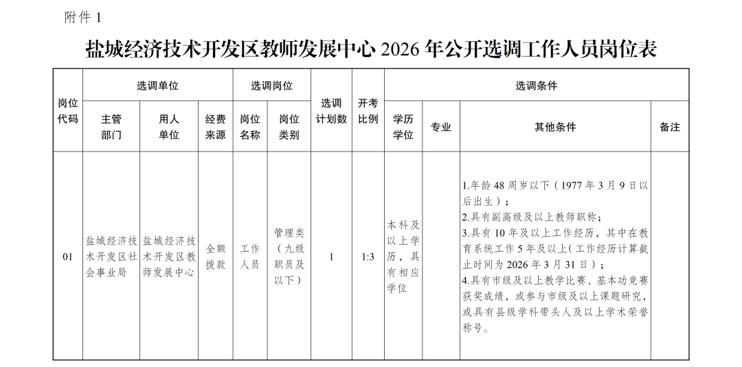 因工作需要,盐城经济技术开发区社会事业局下属事业单位盐城经济技术开发区教师发展中心面向全市公开选调工作人员1名。