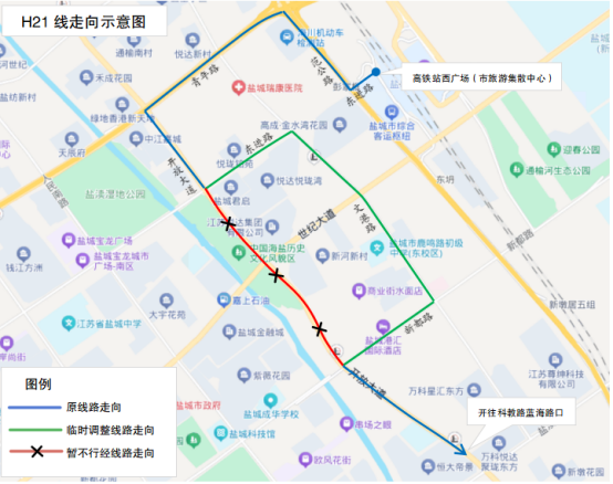原线路走向:高铁站西广场、东进路、运河路、向海路、范公路、青年路、开放大道、海洋路、康居路、南环路、科教路、科教路蓝海路口。