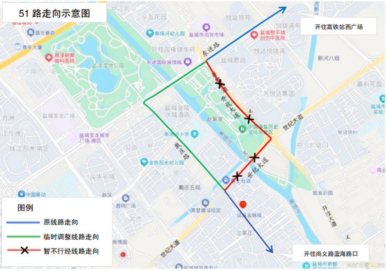 原线路走向:黄海湿地博物馆(西)、范公路、五星路、运河路、东进路、开放大道、世纪大道、神州路、海洋路、开创路、新都路、珍时路、盐盘路、汽车客运西站。