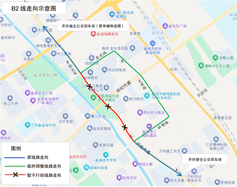 调整后走向:城北公交回车场(原华健物流园)、开放大道、东进路、文港路、新都路、开放大道、盐丰快速通道、开放大道、大仓路、花园路、便仓公交回车场。