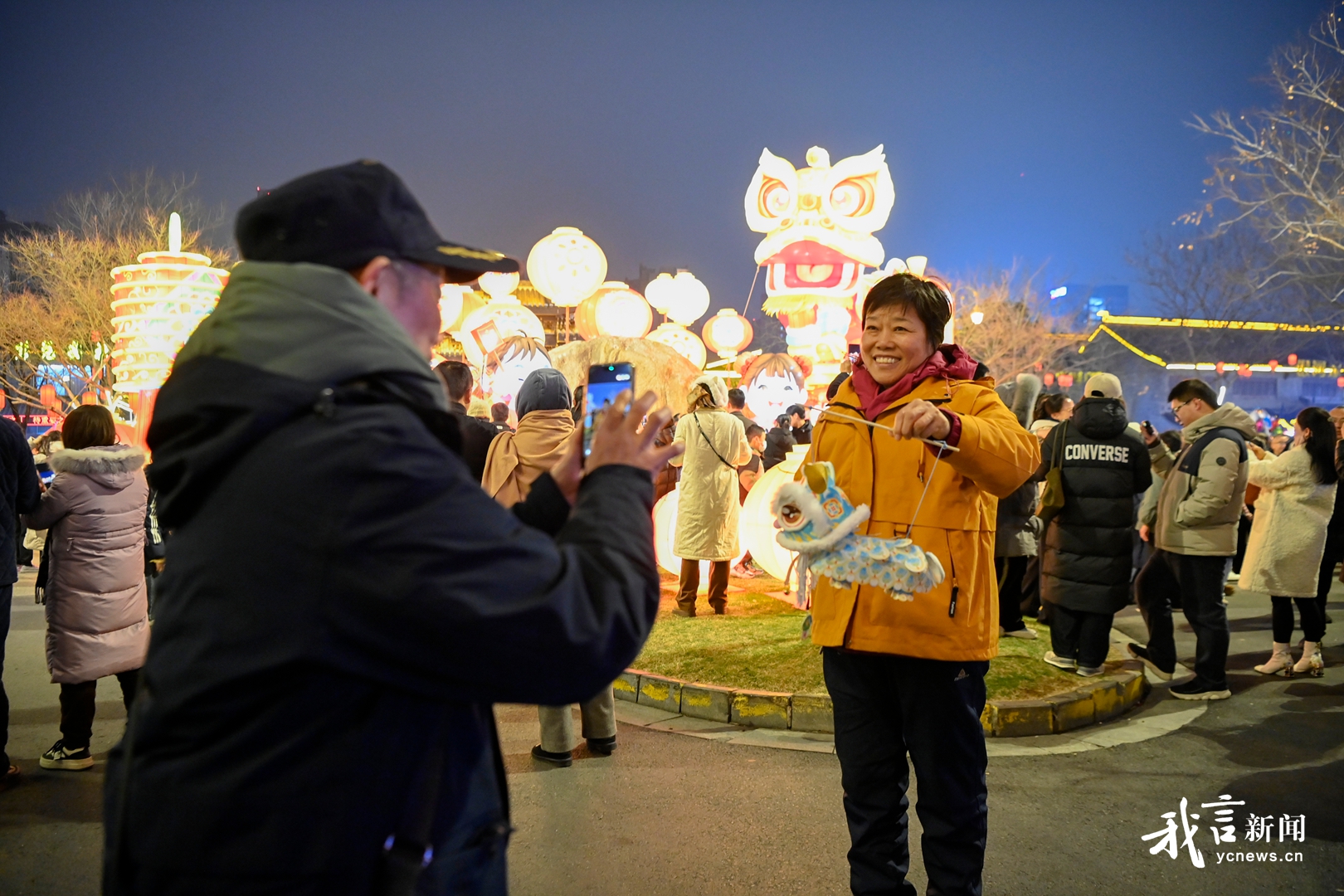 在水云阁广场“湿地三宝”灯组前,市民陈兰芳举着手机,来回挪了几步,找了个满意的角度,冲老伴儿招手:“往中间站点,对对对,就那儿。”她一边盯着屏幕,一边笑着说:“麋鹿是肯定要拍的,咱们盐城的特色嘛。”